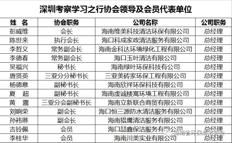 在中国共产党十九大召开之际,海南省环保清洁服务行业协会应深圳市环卫清洁行业协会邀请,为深入打造“海南服务”新品牌、建设服务业强省,加快服务业创新发展、增强服务经济发展新动能,积极响应国家十三五规划中“走出去、引进来”的战略部署,提升我省服务业质量水平,促进省内外优秀企业的相互交流,学习先进管理经验和做法,帮助我省企业拓宽视野、提升质量管理水平。 10 月19日至21日,会长彭威维、执行会长陈世来带领我省清洁同行企业代表一行14人赴深圳市进行了为期2天的考察交流学习。
